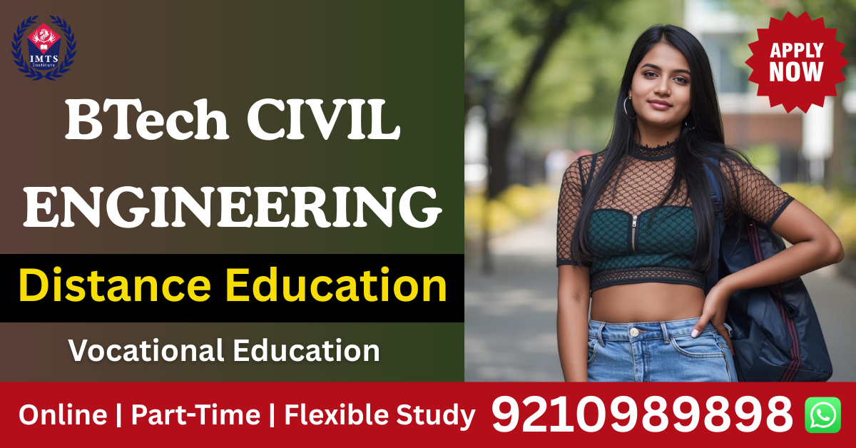 Program Description: BTech Civil Engineering Distance Education trains students in construction principles, structural analysis, surveying methods, and infrastructure development through flexible learning modules suited for working professionals.