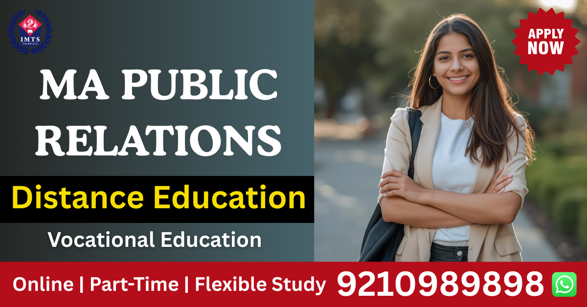 MA Public Relations Distance Education Admission 2026 provides flexible postgraduate education for communication professionals. last date on 30 March 2026 at recognized universities offering affordable fees and quality education. The program covers strategic communication, crisis management, and digital PR through self-paced online learning. Graduates work as PR managers, communication specialists, and brand consultants earning INR 3 to 18 LPA across industries. Universities like IGNOU, MIT University Sikkim, and IMTS Institute deliver comprehensive curriculum with placement support. Complete the two-year program while maintaining employment and build successful careers in corporate communication, media relations, and reputation management fields effectively.