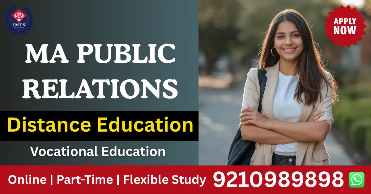 MA Public Relations Distance Education Admission 2026 provides flexible postgraduate education for communication professionals. last date on 31st January 2026* at recognized universities offering affordable fees and quality education. The program covers strategic communication, crisis management, and digital PR through self-paced online learning. Graduates work as PR managers, communication specialists, and brand consultants earning INR 3 to 18 LPA across industries. Universities like IGNOU, MIT University Sikkim, and IMTS Institute deliver comprehensive curriculum with placement support. Complete the two-year program while maintaining employment and build successful careers in corporate communication, media relations, and reputation management fields effectively.